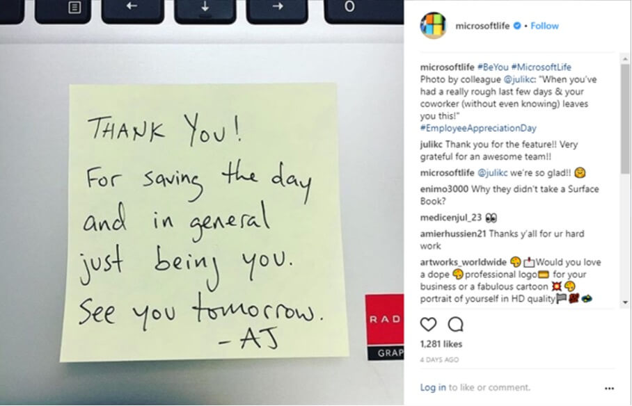 Kurum kültürü genelde elle tutulamaz soyut değerlerden oluşur. Bu nedenle bu kültürü adaylara göstermeniz çok da kolay değildir. Fakat Microsoft’un sosyal medya kariyer hesabından paylaştığı bu fotoğraf aslında çok basit bir şekilde, şirketin işbirliği, güven ve destek değerlerini kanıtlamasına yetiyor.