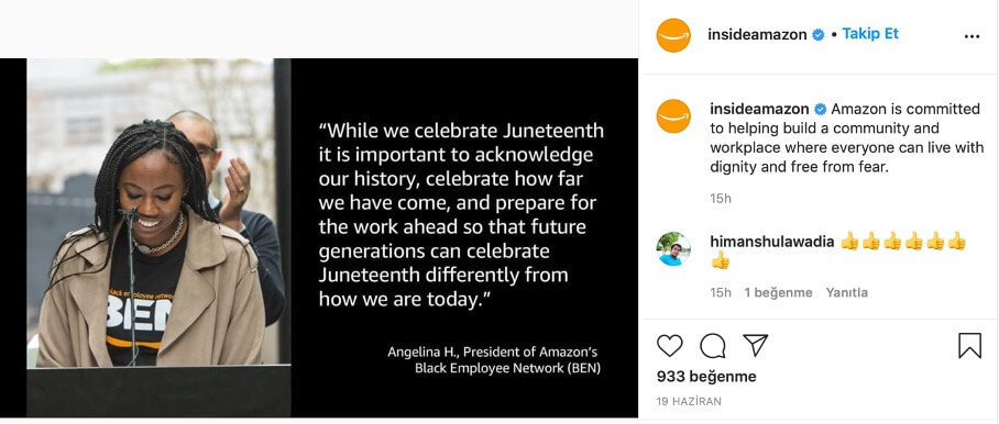 Kariyer hesaplarında çalışan hikâyelerine yer veren bir diğer marka ise Amazon. Çalışanlarının hayattaki duruşlarını güçlendiren Amazon, Siyah Çalışanlar Ağı (BEN) sözcüsü olan çalışanının ilham verici bir konuşmasını da işveren markası hesabı olan Inside Amazon üzerinden yayınlıyor ya da karantina günlerinde eline gitarını alıp şarkı söyleyen bir çalışanının videosunu paylaşıyor.